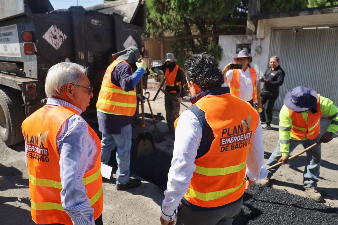 Durante el recorrido, informó que las ocho cuadrillas habilitadas en el Plan de Bacheo Permanente intensifican labores para atender las rutas más transitadas y garantizar calles más seguras y en mejores condiciones.