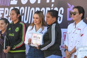 Durante el acto inaugural, autoridades municipales, integrantes del cabildo y patrocinadores entregaron reconocimientos a invitados especiales como Maryan Reyes Camacho, jugadora profesional; Sergio “El Zamba” Rosas, entrenador; Gabriela Sarali Rivas, entrenadora; y Luis Armando Medina Guillén, representado por su hija, Mariela Medina García.
