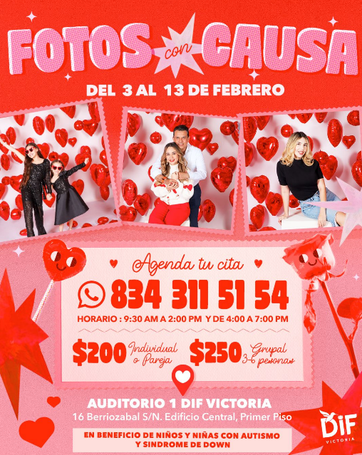 Cd. Victoria, 3 de febrero de 2026. – A partir del día de hoy, el DIF Victoria, en conjunto con su Presidenta Lucy de Gattás, invitan a las familias de la capital a participar en el set “Fotos con Causa”, una actividad pensada para llevarse un bonito recuerdo del mes del amor mientras se apoya una noble causa.