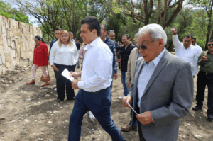 En compañía del gerente de la Comisión Municipal de Agua Potable y Alcantarillado (COMAPA), Fernando García Fuentes, y el secretario de Obras Públicas del Municipio, Eusebio Alfaro Reyna, recorrió la cimentación de la obra hídrica que beneficiará a 146,314 ciudadanos.
