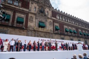 Ciudad de México, 06 de diciembre de 2025.- El gobernador de Tamaulipas, Américo Villarreal Anaya, junto a la doctora María de Villarreal, presidenta del Sistema DIF Tamaulipas, acompañó a la presidenta Claudia Sheinbaum Pardo durante la celebración de los 7 años de la Cuarta Transformación, ante más de 600 mil mexicanas y mexicanos reunidos en el Zócalo de la Ciudad de México.