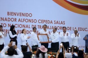 En el evento, el mandatario tamaulipeco recibió el reconocimiento de parte del Comité Directivo Seccional del SNTE por “impulsar políticas y acciones que