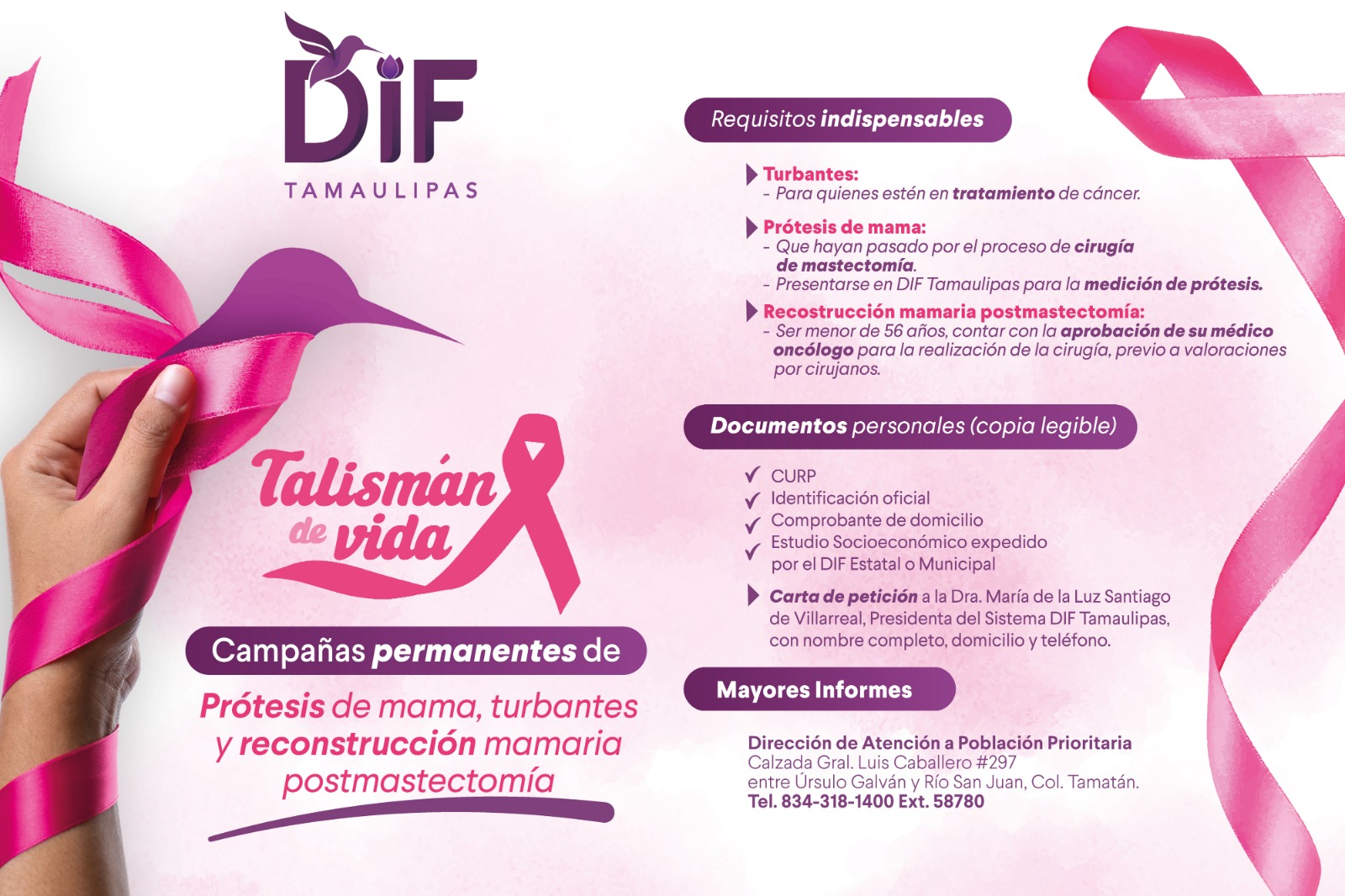 Ciudad Victoria, Tamaulipas.– Con el firme propósito de respaldar a las mujeres que enfrentan o han enfrentado la lucha contra el cáncer de mama, el Sistema para el Desarrollo Integral de la Familia de Tamaulipas, que preside la doctora María de Villarreal, mantiene abiertas las campañas permanentes de prótesis de mama, turbantes y reconstrucción mamaria postmastectomía.