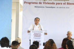 Matamoros, Tamaulipas, 01 de abril de 2026.- Tamaulipas refrendó su liderazgo nacional en el programa de Vivienda para el Bienestar, al entregar en el desarrollo habitacional El Mezquital, 19 casas nuevas construidas por la Comisión Nacional de Vivienda para familias de pescadores, en un evento encabezado por la presidenta Claudia Sheinbaum, en enlace virtual con el gobernador Américo Villarreal Anaya.