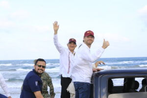 Posteriormente, realizó un recorrido en el Campo Tortuguero, en donde el secretario de Desarrollo Urbano y Medio Ambiente, Karl Heinz Becker, le explicó que ya se cuenta con 16 nidos y 1,440 huevos de tortugas, que han comenzado a arribar a cuatro de los siete campamentos en la playa de La Pesca.