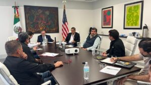 Durante esta agenda de trabajo, Camacho Nieto estuvo acompañado por el subsecretario de Desarrollo Sostenible y Comercio Exterior, Sergio Carlos Guajardo Castellanos, así como por el director de Exportaciones, Conectividad y Logística, José María Hernández Gómez.