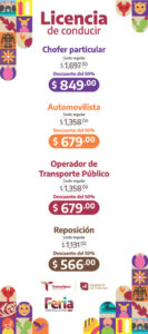 - Licencia de operador de transporte público: de $1,358 a $679 pesos