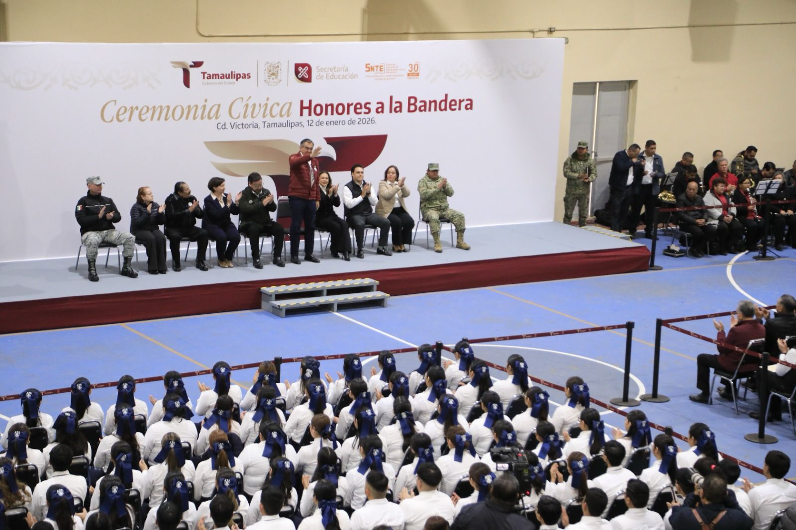 Ciudad Victoria, Tamaulipas, 12 de enero de 2026.– El gobernador de Tamaulipas, Américo Villarreal Anaya resaltó el papel trascendental de la educación y del magisterio en la formación de una sociedad más humana, justa y con visión de futuro, al presidir la Ceremonia de Honores a la Bandera en la Benemérita Escuela Normal Federalizada de Tamaulipas.