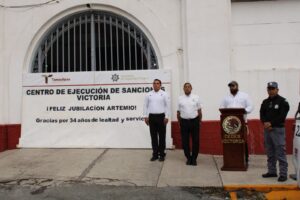 Cd. Victoria, Tamaulipas.– 1 de noviembre de 2025. El Centro de Ejecución de Sanciones (CEDES) Victoria rindió un emotivo homenaje al custodio Artemio Rivera Cadengo, quien concluyó su servicio activo tras 34 años de trayectoria en la Secretaría de Seguridad Pública de Tamaulipas (SSPT).