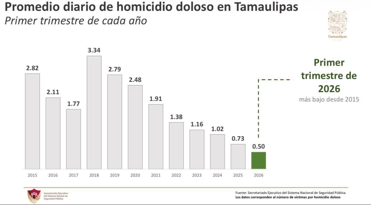 El Secretariado Ejecutivo del Sistema Nacional de Seguridad Pública detalló que durante el primer trimestre de 2026, Tamaulipas consolidó esta tendencia a la baja, la cual se ha registrado desde el inicio de la actual administración estatal.