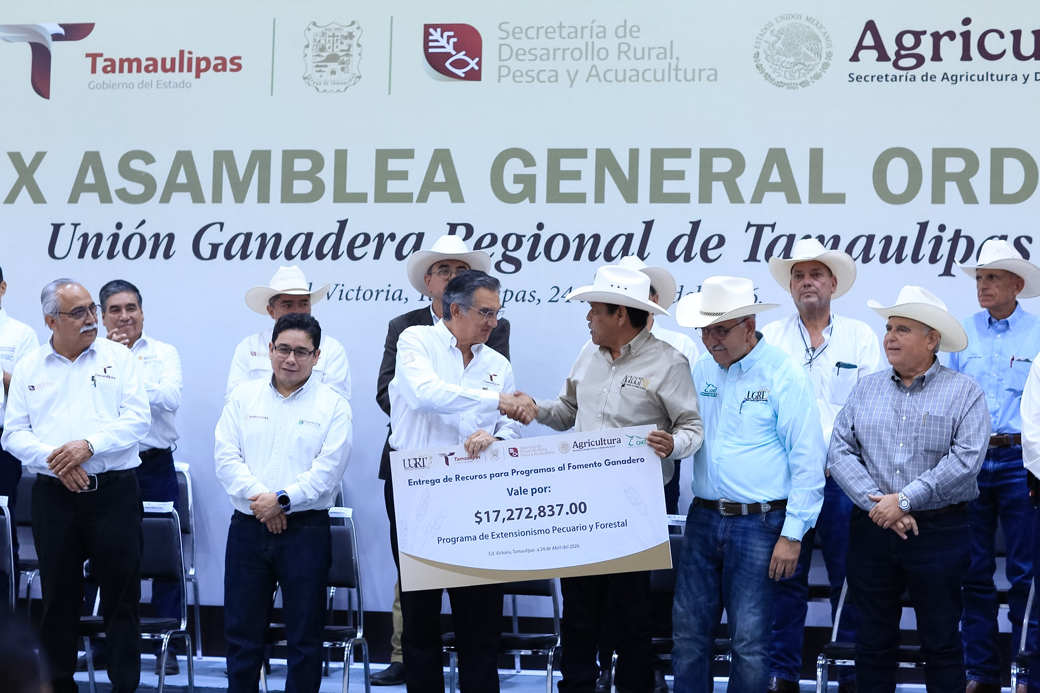 Ciudad Victoria, Tamaulipas, 24 de abril de 2026.- El gobernador Américo Villarreal Anaya refrendó todo su respaldo al sector ganadero, a fin de seguir impulsando esta vocación y tradición que da identidad a Tamaulipas, y entregó más de 80.7 millones de pesos como apoyo para diversos programas de sanidad animal, mejoramiento genético y extensionismo pecuario.