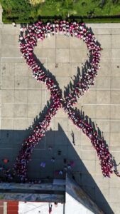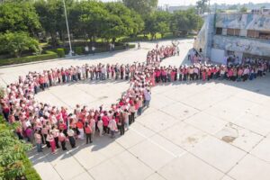 En un acto solidario y simbólico, las y los participantes, portando prendas en color rosa, se reunieron en la explanada de las oficinas centrales de la SET para formar un gran moño humano, ícono de la lucha contra esta enfermedad.