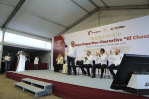 Altamira, Tamaulipas, 09 de abril de 2026.- El gobernador Américo Villarreal Anaya realizó una gira de trabajo en el sur del estado, en donde presidió la Mesa de Seguridad en Ciudad Madero y, después, en Altamira, visitó a las y los productores de sal en la Congregación Lomas del Real e inauguró el campo deportivo y recreativo El Chocolate.